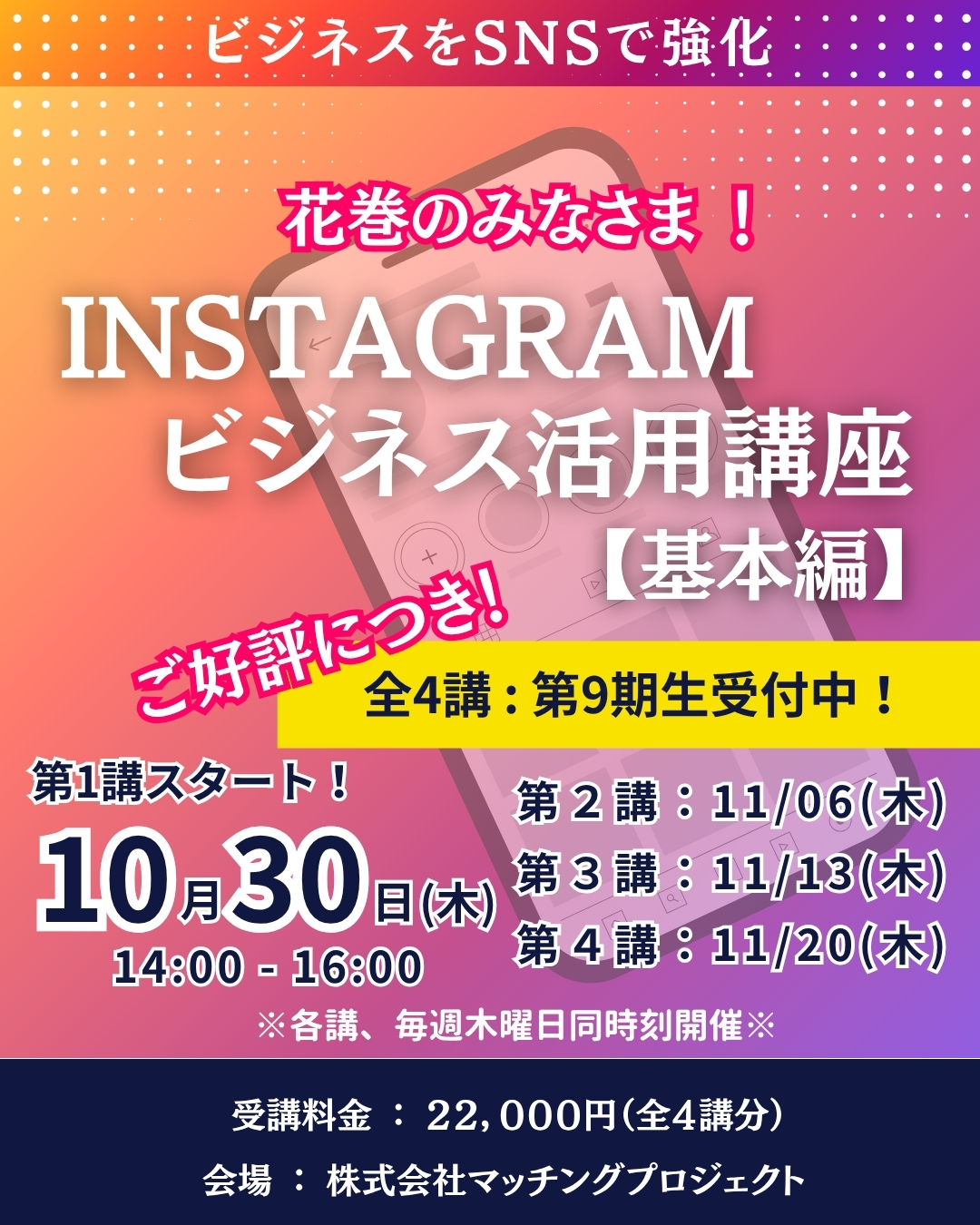 しっかりと、知識を付けた上で、自信をもって楽しんで投稿するための「インスタビジネス活用講座」です。