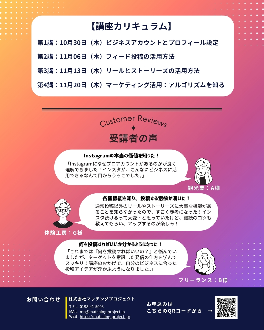 そこで本講座では、インスタグラムの基本から売上に直結する活用法を、わかりやすく丁寧にお伝えします!